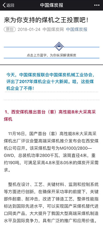 1月24日,中國煤炭報聯(lián)合中國煤炭機械工業(yè)協(xié)會,評出了2017年煤機企業(yè)十大新聞,“西安煤機推出首臺(套)高性能8米大采高采煤機”新聞入選。