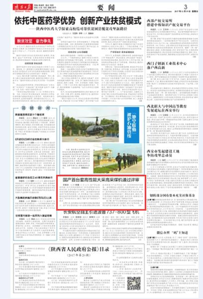 陜西日?qǐng)?bào):國產(chǎn)首臺(tái)套高性能大采高采煤機(jī)通過評(píng)審