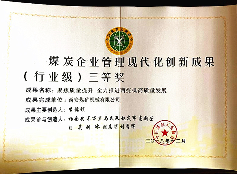3月29日,從中國煤炭工業(yè)協(xié)會在寧波召開的2019年煤炭企業(yè)管理現(xiàn)代化創(chuàng)新成果工作會議上傳來喜訊,公司申報的管理創(chuàng)新成果《聚焦質(zhì)量提升 全力推進西煤機高質(zhì)量發(fā)展》,榮獲2018年煤炭企業(yè)管理現(xiàn)代化創(chuàng)新成果三等獎。此次榮譽的獲得,是中國煤炭工業(yè)協(xié)會對西煤機在管理創(chuàng)新領(lǐng)域一系列探索和實踐給予的肯定。