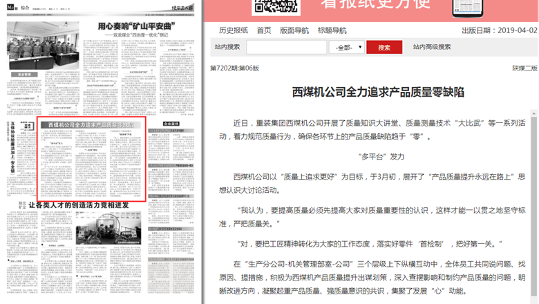 陜西工人報:西煤機公司全力追求產品質量零缺陷
