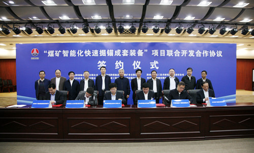 為解決煤礦采掘接續(xù)平衡問(wèn)題,實(shí)現(xiàn)礦井掘進(jìn)過(guò)程自動(dòng)化、智能化、無(wú)人化,4月4日,榆北煤業(yè)公司、曹家灘礦業(yè)公司、陜煤集團(tuán)技術(shù)研究院、中國(guó)鐵建重工集團(tuán)、西安重裝集團(tuán)、西煤機(jī)公司6家單位在西煤機(jī)公司簽訂了“煤礦智能化快速掘錨成套裝備”項(xiàng)目聯(lián)合開(kāi)發(fā)合作協(xié)議?!傲胶献鳌眱A力打造安全可靠的煤礦智能化快速掘錨成套裝備,共同為智能化快速掘進(jìn)系統(tǒng)推廣開(kāi)創(chuàng)先河。