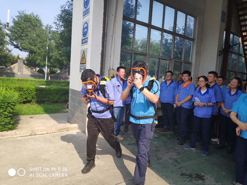 此次演練分兩個部分舉行,第一部分為桌面演練,桌面演練模擬大氮?dú)夤抻幸惶庨y門漏氣,熱加工分公司全體參加培訓(xùn)、演練人員在熱加工分公司會議室由安全員集中培訓(xùn),宣布要求,做好演練準(zhǔn)備,然后進(jìn)行緊急防護(hù)裝置演練、熟悉逃生路線、氮?dú)庑孤稇?yīng)急預(yù)案簡單描述、正壓式呼吸器的正確使用方法,最后由朱經(jīng)理發(fā)布應(yīng)急結(jié)束指令。第二部分為實(shí)戰(zhàn)功能演練階段,全體人員在氨氣站門口集中培訓(xùn),宣布要求,做好演練準(zhǔn)備,先進(jìn)行正壓式呼吸器,洗眼器的使用演練,然后模擬氨氣站法蘭螺栓松動發(fā)生泄露應(yīng)急演練。全體人員通過此次實(shí)戰(zhàn)演練,學(xué)習(xí)了應(yīng)急處理辦法,經(jīng)歷了別開生面的體驗(yàn)。(田林)