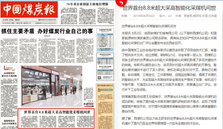 中國煤炭報:世界首臺8.8米超大采高智能化采煤機問世