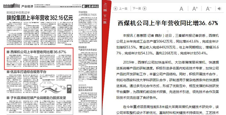 三秦都市報(bào):西煤機(jī)公司上半年?duì)I收同比增36.67%
