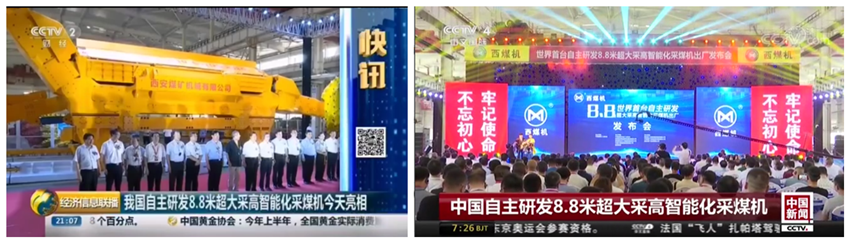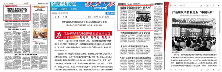 8月2日,由公司自主研發(fā)世界首臺(tái)8.8米超大采高智能化采煤機(jī)出廠評(píng)議會(huì)暨發(fā)布會(huì)召開(kāi)后,得到了中國(guó)新聞、陜西新聞聯(lián)播、中國(guó)煤炭報(bào)、科技日?qǐng)?bào)、人民網(wǎng)、新華網(wǎng)等76家中央和省級(jí)主流媒體的關(guān)注報(bào)道。