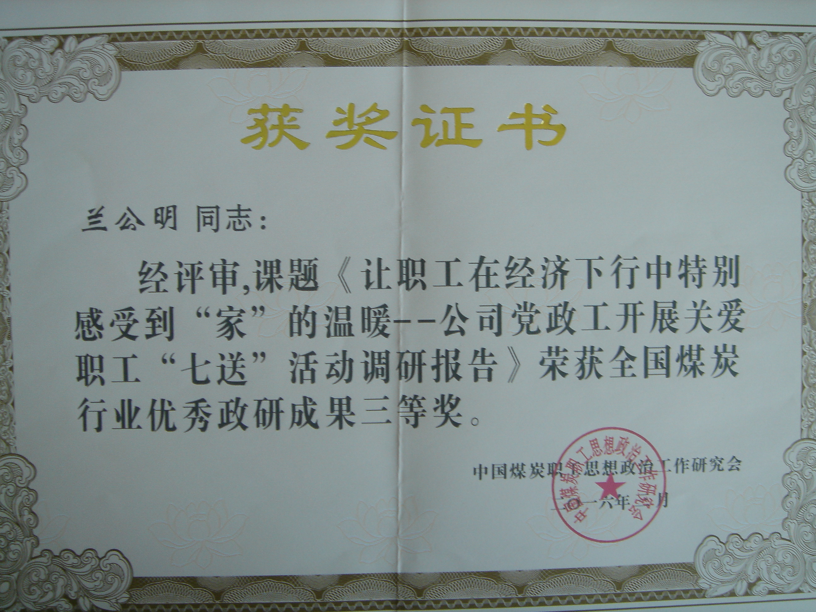 公司政工干部蘭公明同志政研論文獲全國(guó)煤炭行業(yè)優(yōu)秀研究成果三等獎(jiǎng)