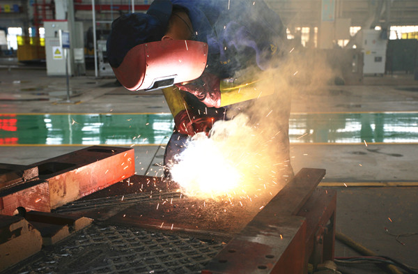 在鉚焊一組,組長(zhǎng)馬峰正在專心焊接門架支腿上方的殼體,小管內(nèi)壁焊機(jī)噴出長(zhǎng)長(zhǎng)的火焰。他們班組干的雖然是小件產(chǎn)品,但責(zé)任一樣重大,手把焊接是個(gè)細(xì)活兒,既需要熟悉圖紙工藝和技術(shù)要求,又要有堅(jiān)韌剛強(qiáng)的意志。他干起活來專心致志,高溫下汗水順著額頭流淌了下來,他都顧不上擦拭,彰顯了一個(gè)鉚焊工精益求精的工作態(tài)度。