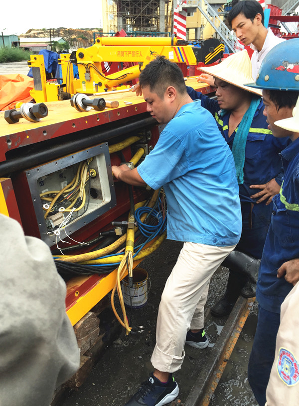 9月11日,河林礦機(jī)組在雨中調(diào)試完畢,順利行走。接下來就是機(jī)組下井工作了。由于越南河林礦地質(zhì)條件復(fù)雜,井下運(yùn)輸設(shè)備小,承載能力達(dá)不到要求,因此地面調(diào)試完成后還需將機(jī)組段成小塊分組運(yùn)輸下井,這給售后技術(shù)服務(wù)人員趙丹、韓鑫的工作任務(wù)又帶來了新的挑戰(zhàn)。他們沒有泄氣,而是一鼓作氣配合礦方工人將機(jī)組進(jìn)行拆解,這一干又是一天多的時間,其辛苦程度不言而喻。