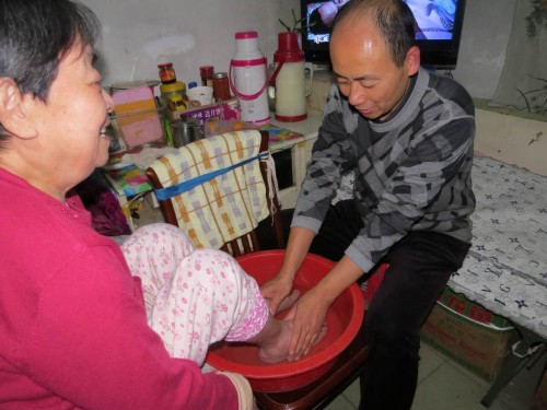 周末,天氣晴朗,在煤機(jī)花園40號(hào)樓底下有一位行動(dòng)不便的老人坐在自制的椅子上,神采奕奕的向周圍的鄰居夸贊著自己的兒子和兒媳婦,告訴大家自己幸福的晚年生活。她就是海師傅的老母親,年近80高齡,因患高血壓、冠心病、類風(fēng)濕性關(guān)節(jié)炎等病癱瘓?jiān)诖?,這一癱便是十幾年,這十幾年全靠這個(gè)孝順的兒子和兒媳婦使她堅(jiān)強(qiáng)的挺了過來,十幾年里,沒有磨滅蔣繼海這個(gè)孝順的兒子的心,反而一心一意的照顧著患病的老母親。有一次,晚上九點(diǎn)多,全家人早早吃過晚飯,收拾妥當(dāng),正準(zhǔn)備上床休息的他,聽到老母親房間里傳來嘔吐的聲音,海師傅嗖的一下從床上躥起來,光著腳丫直奔老母親的臥室,看見老母親正在難受的嘔吐,將晚上吃的飯吐了一地,軟軟的癱在床上,嘴里還在嘰里咕嚕的說些聽不懂的話。海師傅馬上把老母親抱起來,瘋了似得沖出了自己家門,一路小跑到了離家最近的北環(huán)醫(yī)院,看見醫(yī)生一個(gè)個(gè)忙碌的背影,一個(gè)人的他這才發(fā)現(xiàn)自己還光著腳,還是隨后趕來的媳婦帶來了住院所需的用品、錢和他的鞋子。因?yàn)榛几哐獕旱睦夏赣H住進(jìn)了醫(yī)院,醫(yī)生要求家屬24小時(shí)進(jìn)行陪護(hù),需要觀察心電監(jiān)護(hù)儀的變化,害怕出現(xiàn)血管爆裂的危險(xiǎn)情況。由于家里還有兩個(gè)正在上學(xué)的孩子需要照顧,所以海師傅一人就全天候地細(xì)心照料著老母親,等到醫(yī)生和護(hù)士來查看病房時(shí),他就趕緊去上趟廁所。深夜里的醫(yī)院病房靜悄悄的,海師傅目不轉(zhuǎn)睛的盯著監(jiān)護(hù)儀,生怕自己出現(xiàn)一點(diǎn)疏忽。當(dāng)母親安全度過24小時(shí)危險(xiǎn)期后,海師傅的眼眶濕潤(rùn)了,母親終于得救了,這也讓全家人都松了一口氣。那段時(shí)間,白天上班,晚上在醫(yī)院看護(hù),讓海師傅的頭發(fā)白了許多。為了不讓母親有負(fù)擔(dān),他總是一副樂呵呵的模樣,這讓病房里的病友們看在眼里,直夸老人說:“你這個(gè)兒子呀,好,孝順,你真有福?!?span>